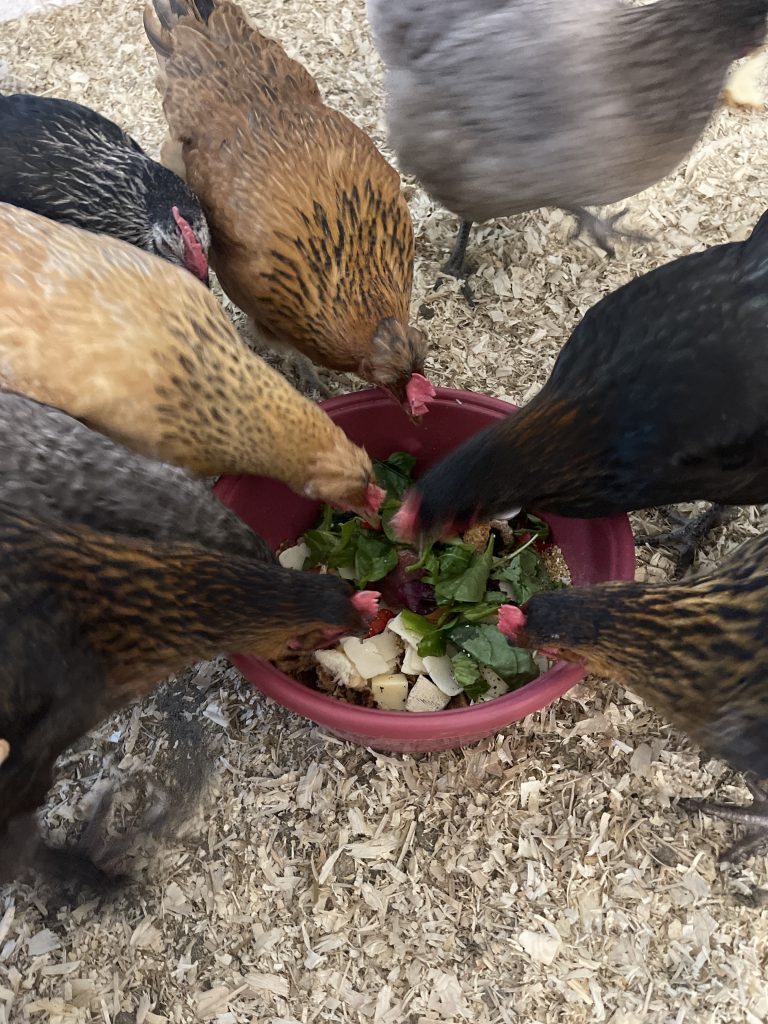 Zusätzlich erhalten unsere Hühner eine vitaminreiche Ernährung mit frischem Salat, Reis, Kartoffeln und verschiedenen Körnern.